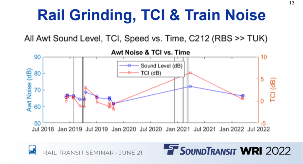 One of the chief concerns at Sound Transit is track and vehicle-born noise. The system has a number of stakeholder-related commitments that it must meet in terms of wayside noise, so these metrics have significant implications in terms of its finances and public approval.