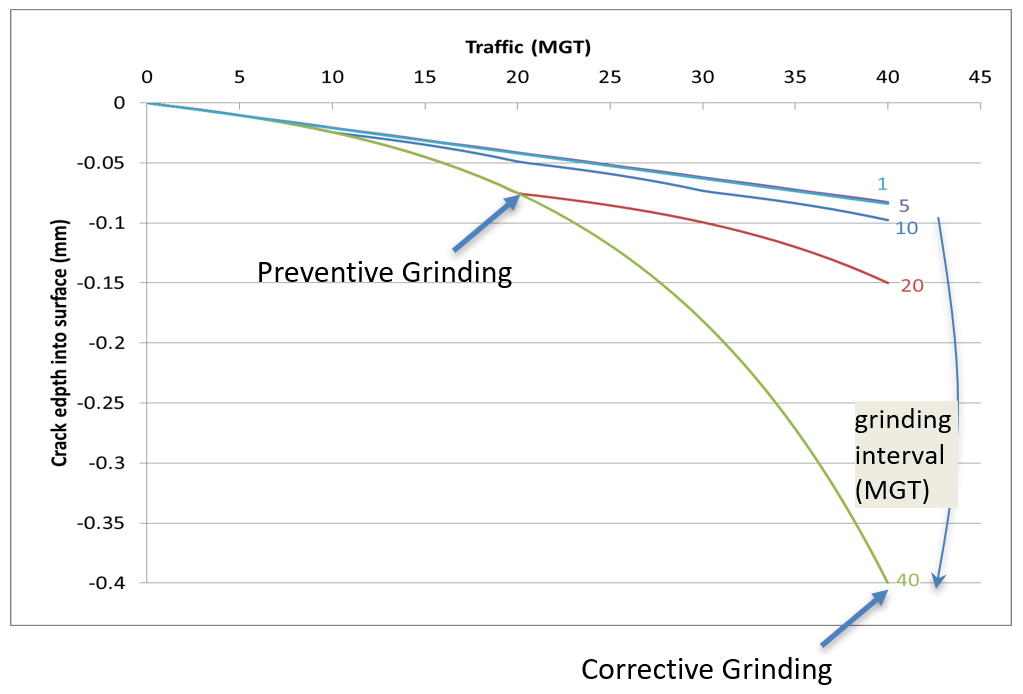 Rail grinding also plays an important role in managing RCF. In addition to being the means by which new rail profiles are implemented, regular preventive grinding is an effective way to arrest the exponential growth of RCF cracks. “10 or 20 MGTs is typically the ideal time to grind,” Magel said, in terms of balancing metal removal and RCF management. Grinding like this effectively resets the crack growth curve (see figure 8).