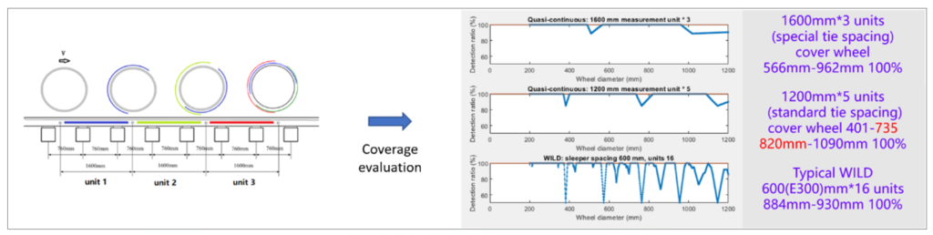 Figure 1 illustrates the basic design of CR’s earlier-model TPDS. In the case of this design, however, there are regions (circled in red) in which wheels pass through a transition zone that can’t properly measure rail shear force. These “dead zones” made up approximately 11% of the TPDS when it was first implemented, Zeng said, making it a “quasi-continuous” measurement system. Full continuous measurement remained the goal for several reasons; first, it would allow for accurate measurement of vehicles with different wheel diameters, and second, it would allow the TPDS to reliably measure wheel circumference, he said. In this case, the solution was fairly simple: the addition of a strain gauge inside the dead zone to effectively make the valid areas overlap (see figure 2).