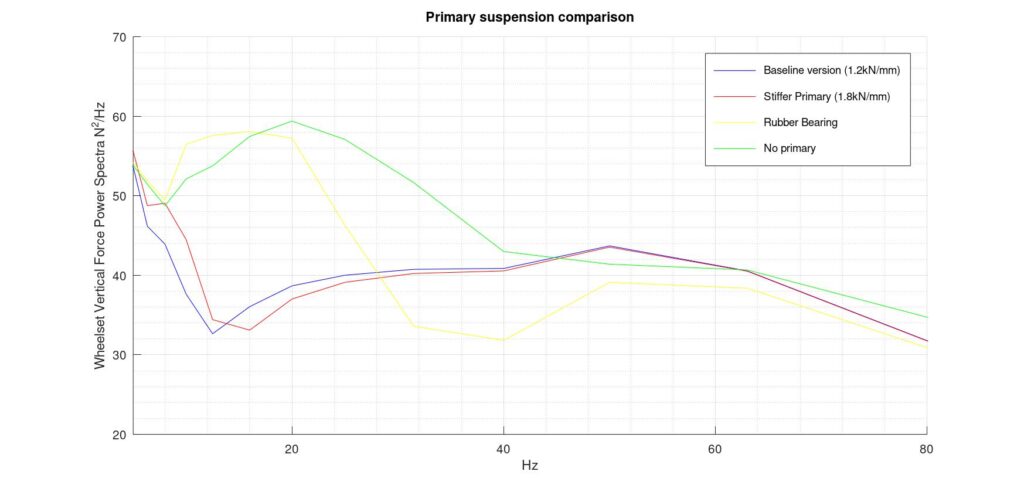 Figure 6 shows an example analysis of primary suspension solutions of varying stiffness, and their effect on truck vibration. In this model, the softer primary suspensions (1.2kN/mm and 1.8kN/mm) significantly outperform the stiff rubber bearing (8kN/mm) and no-suspension solutions. “Of course, it’s always better to have some suspension than none, but there is an improvement by a factor of four in terms of force power spectra when moving to a soft suspension,” Stadler’s Sergio Perez said.