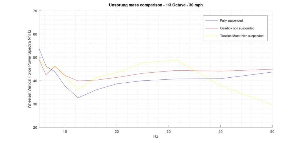The same simulation can be used to isolate and model unsprung mass values. In this case, three values are modeled: a baseline fully suspended drive, a partially-suspended/gearbox-unsuspended drive, and an unsuspended drive and motor (see Figure 7). In this model, the results for the three variations are very similar, but there are caveats. First is that all variants in the model have resilient wheels, potentially damping the effects of unsuspended components, Perez said. “And this model doesn’t give us much information past 40hz, likely underestimating the impact of the fully unsuspended drive,” he added. Models including higher frequencies and tests Stadler has performed indicate that a fully unsuspended drive imparts about 30% more vertical dynamic force to the system than baseline for a vehicle moving at 30 mph.