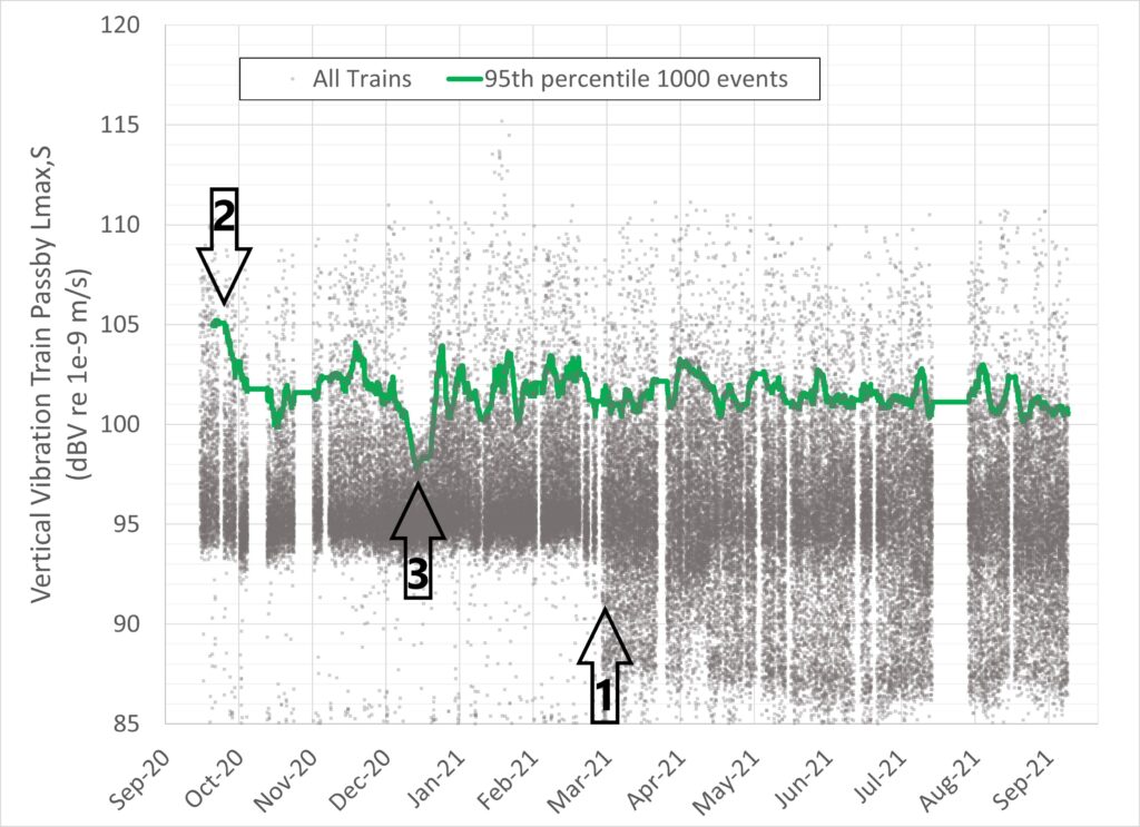 Figure 3 shows some of the data collected in the study – specifically vertical vibration data over the course of one year. The green line shows the 95th percentile of maximum vibration levels, averaged over 1000 events (95th percentile vibration level is a metric used for vibration standards and compliance in Australia).