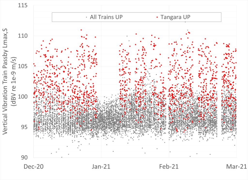 The Waratah trains were introduced between 2011 and 2018 and make up 81% of the traffic on the North Sydney line. Tangara trains, introduced between 1988 and 1995, make up 16% of the traffic, and the remaining 3% is made up of other train types. “The Tangara are older, but very similar in specification to the Waratah trains,” Croft said. The differences between these trains becomes quite clear, however, when the Tangara trains are highlighted in the vibration data. The Tangara trains, despite making up a small percentage of the fleet, account for nearly all of the high vibration events (see figure 4). On average, the Tangara trains generated +5 dBV vertical vibrations and +6 dBV lateral vibrations, compared to the Waratah trains, Croft said.