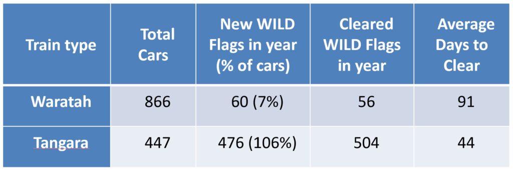 To compare wheel condition between the two car types, Croft looked at wheel impact load detector (WILD) data network-wide over the same time period as the vibration data. This data showed that out of 866 Waratah cars, 60 (7%) generated WILD flags. Of the 447 Tangara cars, 476 (106%) generated WILD flags. “This made it clear that wheel flats were driving the difference in vibration events,” she said.