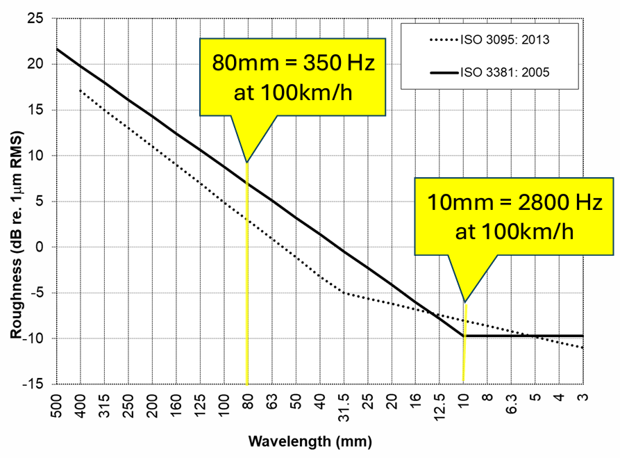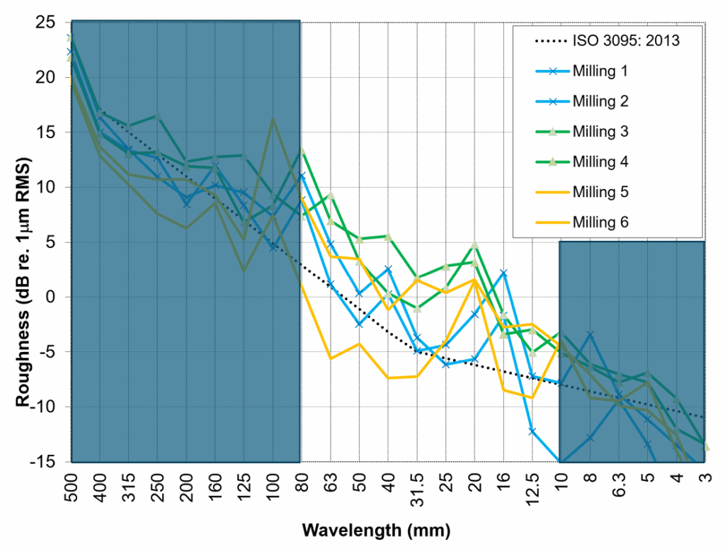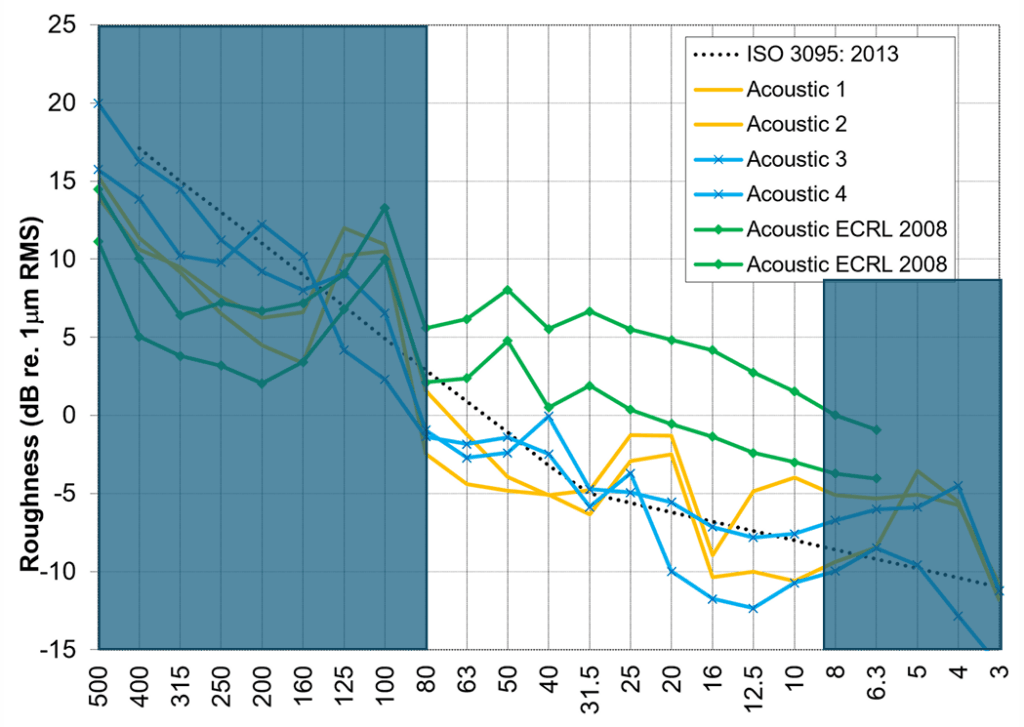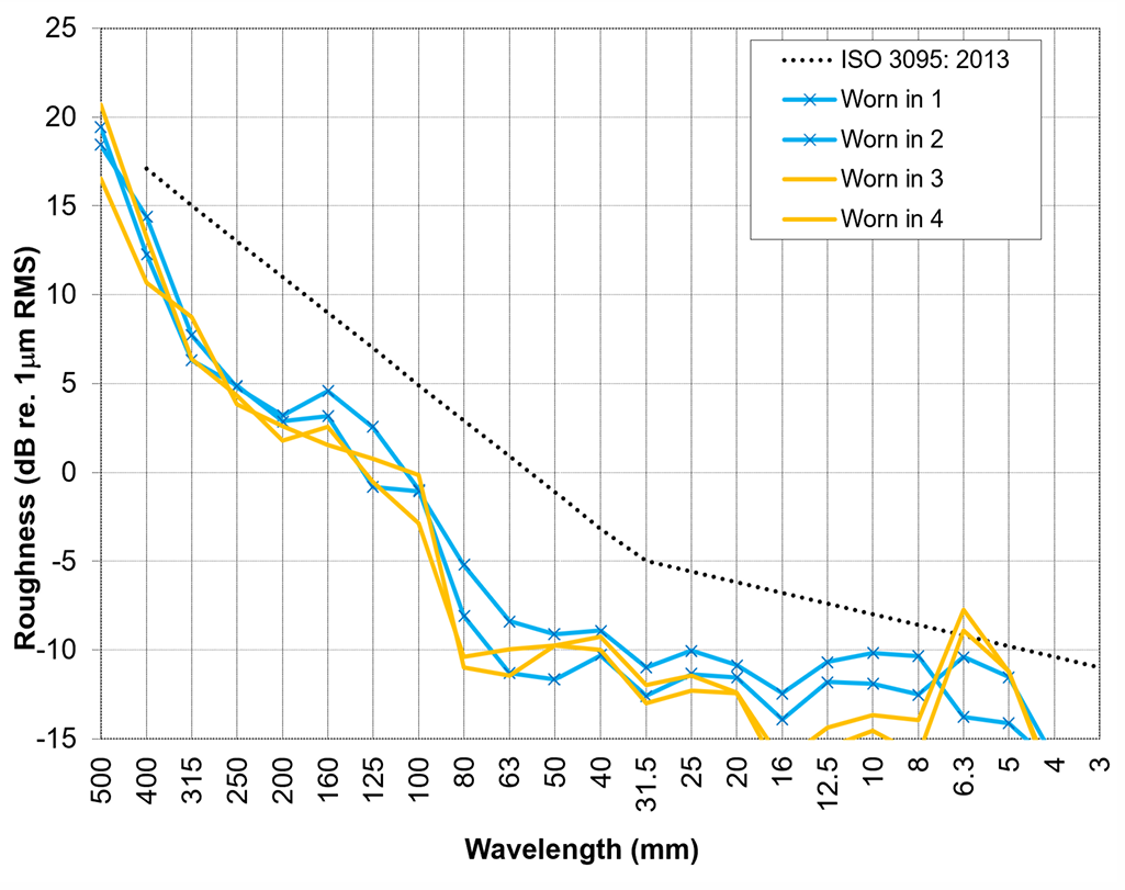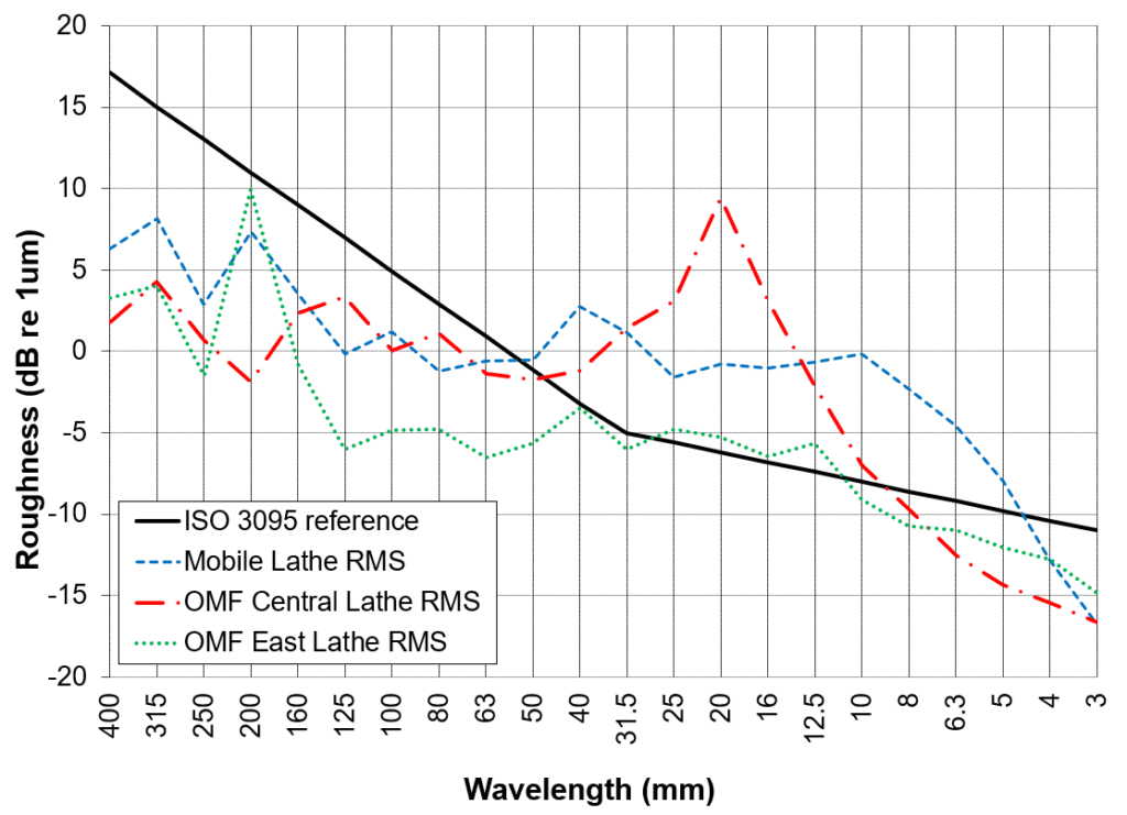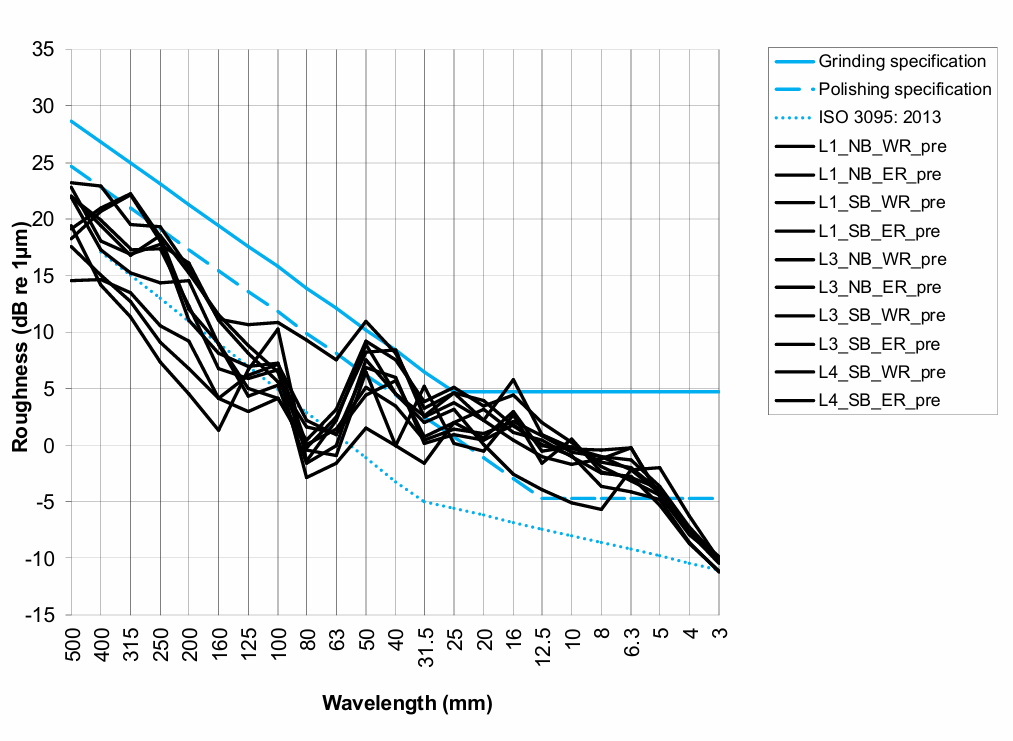 The yellow and blue lines represent North American transit systems experimenting with standard grinding equipment but much higher-grit (finer) stones. While there is a good deal of variation in the results, they show that roughness measurements in the area of concern for noise generation (10 mm to 80 mm) are within 5 dB of the ISO 3095 reference line.