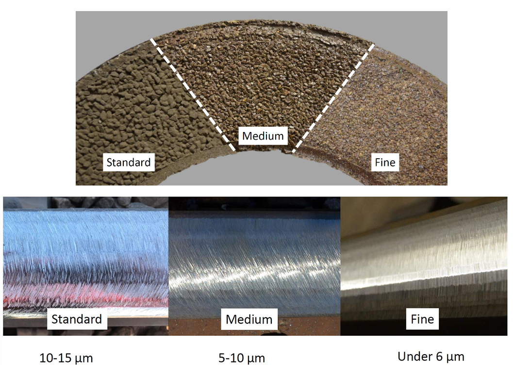 Figure 2 shows a comparison of grinding-stone grit (standard/low-grit, medium, and fine/high-grit) and the associated post-grind finish that can be achieved by each stone. “You can’t really tell how much noise a rail is going to make just by looking at surface micro-roughness, but it’s nonetheless an important measurement to make, and easily done via a handheld surface measuring device,” Croft said.