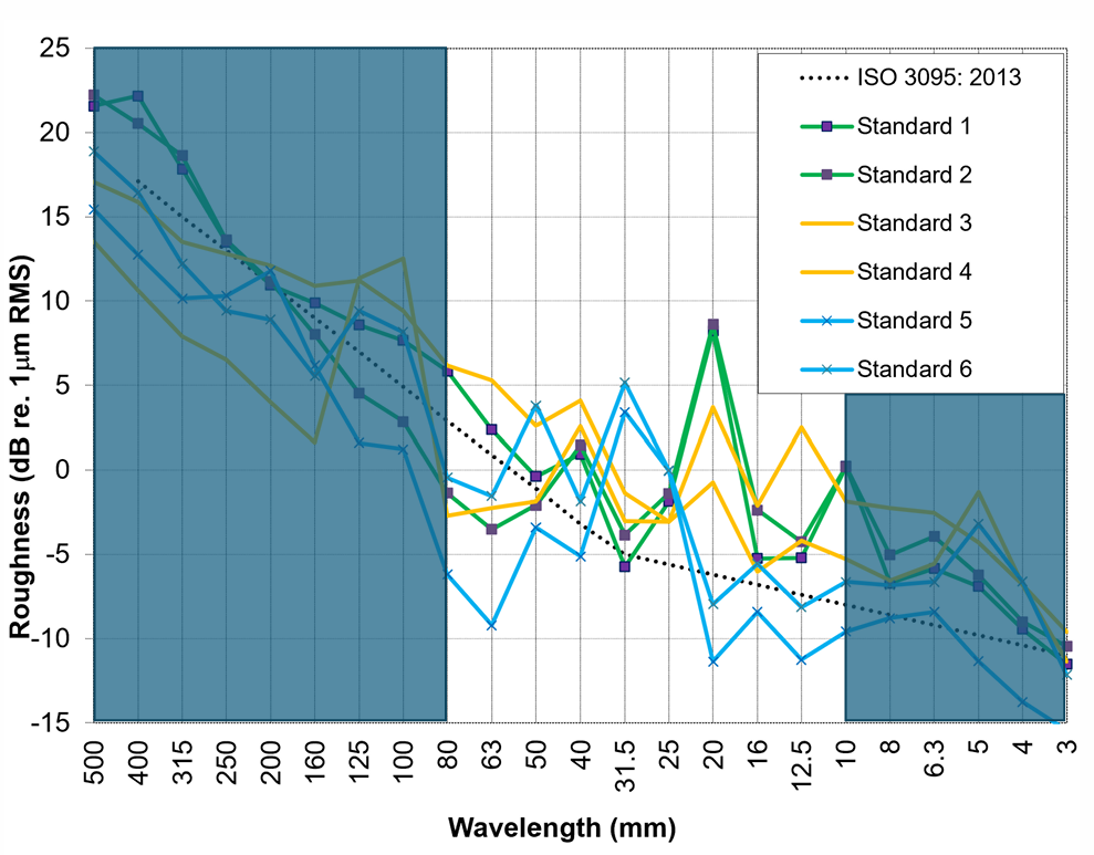 The ISO standards were never intended to be used as grinding specifications, however. They were developed for testing vehicles, Croft said. The standard essentially represents rail that is so “smooth” that it contributes very little to the combined roughness in the wheel/rail interface, so that vehicle-generated effects can be more clearly identified.