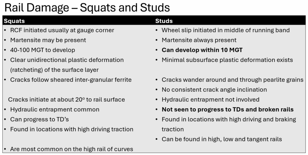 Although studs are called “squat-type defects” due to their appearance, “the causes and consequences of these defects are very different,” Reimer said. Figure 2 summarizes some of the known characteristics of both squats and studs. Perhaps the most important among their differences is that studs can develop within 10 MGT and that unlike squats there is no evidence that studs can develop into a transverse defect or broken rail. “There doesn’t appear to be any critical safety implications with studs [as there are with squats],” he said. “And although there have been rail breaks at or near studs, they don’t seem to have occurred because of the studs.”
