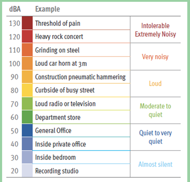 In discussing noise, it’s also important to have a basic understanding of decibel noise levels. “There are a lot of kinds of decibels,” Croft said. The decibel (dB) describes the loudness of a sound. The A-weighted decibel (dBA), which is commonly used in the industry, also describes the loudness of sound, but with an adjustment factor applied for human noise sensitivity (see Figure 1). In the rail industry, dBA measurements are also often described by time variance, since transit environment noise and vibration levels vary over time.