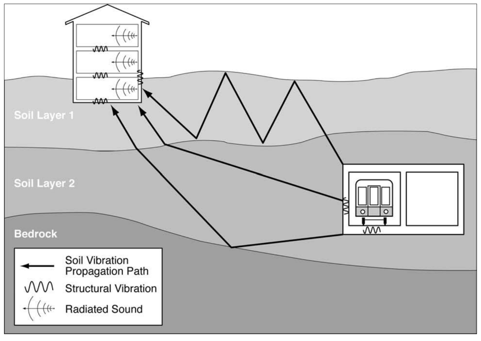 Groundborne vibration and the associated noise is an issue requiring careful attention for transit systems. “The propagation path of noise and vibration is typically through the wheels and rails into the ground (including both subway and surface track), through the soil layers and into the buildings nearby,” Croft said. This causes walls and floors to vibrate and re-radiate low-frequency noise (see Figure 4). “Often the re-radiation of groundborne noise is the real issue, rather the vibration itself,” she said. Accordingly, contributors to groundborne noise include:
