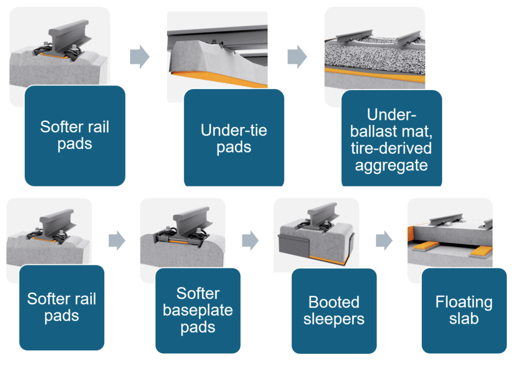 Resilient elements in the track include (on ballasted track) softer rail pads, under-tie pads, and under-ballast mats. On slab track, these elements include softer rail pads, softer baseplate pads, booted ties, and floating slab construction (which can be based on rubber bearings, coil springs, and other designs). See Figure 5 for examples of these resilient components and their configurations.