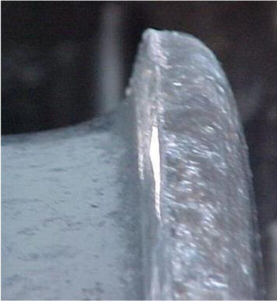 Like so many other aspects of railroading, a switch point will usually tell you that a problem is developing. A point that shows flange contact is saying “pay attention to me as I wear.” A thin point is more likely to break out, especially if here is an overflow lip on the stock rail. Wheel contact can also cause a point to wear in the shape of a ramp (Figure 3). Both abnormal shapes can give a worn flange the purchase it needs to climb.