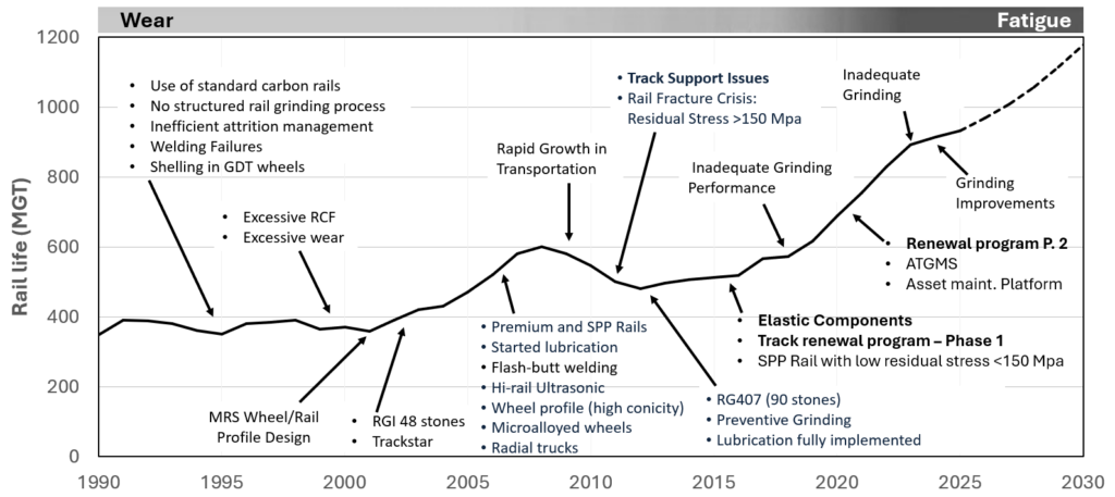 MRS Logistica has undertaken a number of upgrades and system-wide improvements and optimizations since becoming the railroad’s operator in 1996 (see Figure 1 for details). Among these efforts has been, and continues to be, a focus on comprehensive track renewal: “This has included cleaning the ballast and improving drainage, adding elasticity into the track system, and moving from wood to concrete ties [an ongoing process],” Antonio Merheb, Consultant at MRS Logistics and Vice-Chair of the International Heavy Haul Association (IHHA) , told attendees of the 2025 Wheel/Rail Interaction Heavy Haul Conference.