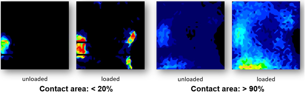 One of MRS primary goals for the project was minimizing rail breaks due to base fatigue—a type of failure that is associated with stress concentration on wood-tie tie plates, particularly near bridges and tunnels, Merheb said. “This type of rail break made up nearly 50% of MRS’ mainline brakes, at the time.” To remedy this, MRS worked with Getzner to develop a thin tie-plate pad designed to better distribute the load between the rail and the tie plate on timber ties (see Figure 4). Their test-site measurements showed that without the pad, the loaded rail/tie plate contact area was, on average, less than 20%. Once the pads were installed, the loaded contact area was, on average, greater than 90% (see figure 5). Based on these results, MRS widely deployed the technology at sites considered to be at elevated risk for rail-base-fatigue breaks.