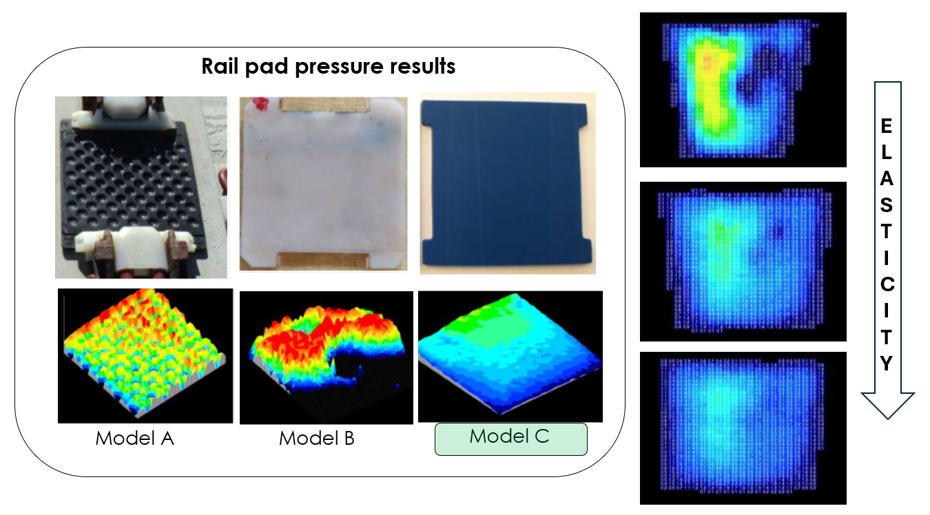 With this in mind, MRS spent three years (2014-2017) testing multiple rail pads and under-tie pads (UTPs). “We tested rail pads with different levels of elasticity to find the best solution for our specific conditions,” Merheb said. Figure 6 shows some examples of rail pads MRS tested, including loaded-pressure-map and elasticity data. They selected a rail pad that they considered to be ideal (with an estimated service life of 12 to 15 years, based on their track conditions and tonnage), then moved on to the next dilemma.