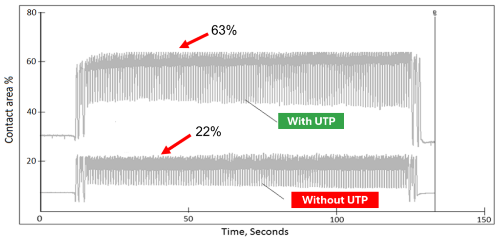 MRS also measured the tie/ballast contact area over time beneath a loaded train. This data (shown in Figure 8) showed that under peak loads, concrete ties with UTPs consistently achieved contact area percentages of 60% (peaking at 63%). Concrete ties without UTPs consistently achieved contact area percentages of <20% (peaking at 22%).