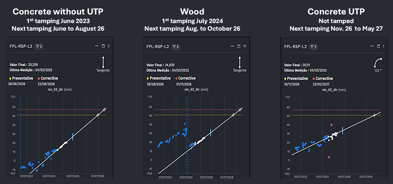 The chart on the far right of Figure 8 shows track geometry degradation for concrete ties equipped with UTPs. The shallow slope of the line in the chart (compared to the charts to the left) indicates a reduced rate of degradation. “Compared to concrete ties without UTPs, concrete ties with UTPs extend tamping intervals by a factor of three,” Merheb said. In other words, concrete ties with UTPs preserve track geometry such that tamping is required ≈3x less frequently.