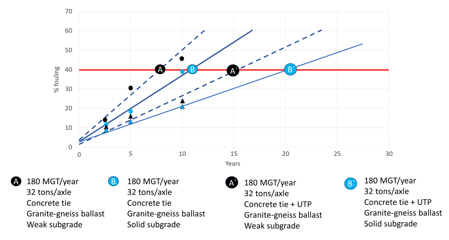 Sections of track equipped with UTPs have also seen a reduction in the rate of ballast degradation/fouling. Figure 10 shows ballast fouling rates based on 10 years of data collected from MRS test sites. The data shows that regardless of subgrade quality, UTPs reduce fouling rates (and thus ballast cleaning/undercutting) by at least a factor of 1.6, depending on MGT/year and subgrade quality, Merheb said.