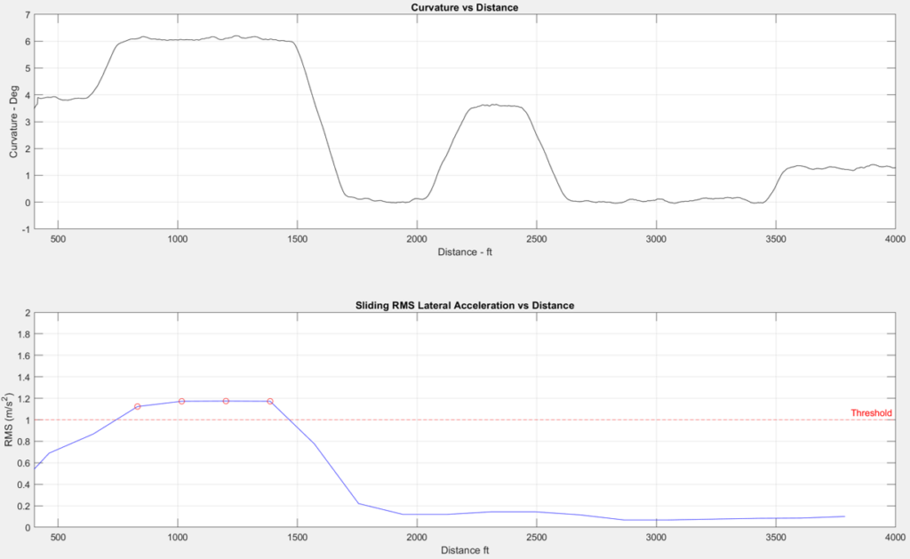 lateral accelerations, with an “uncomfortable” threshold of 1 m/s2 (ISO 2631). Figure 3 shows the results of the simulation. There are several slight exceedances throughout the 6-degree curve, but everything else is well below the threshold.