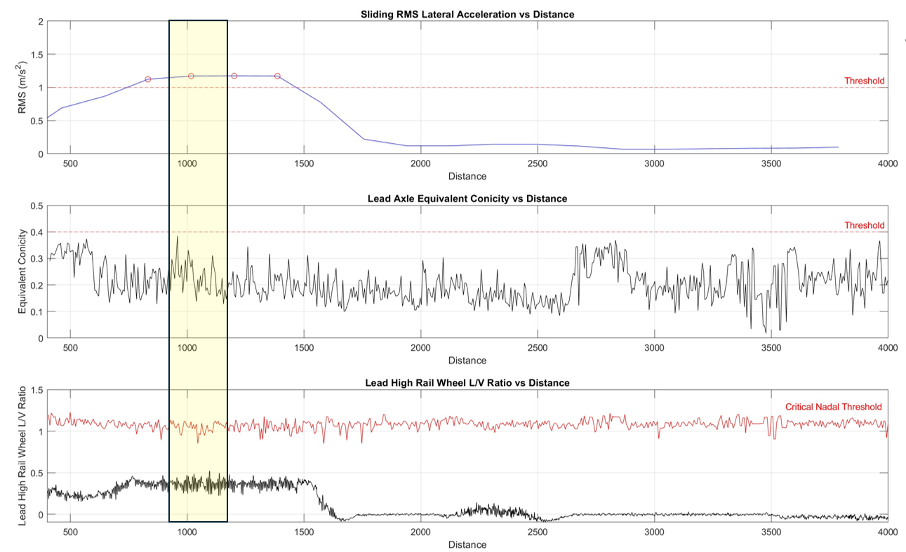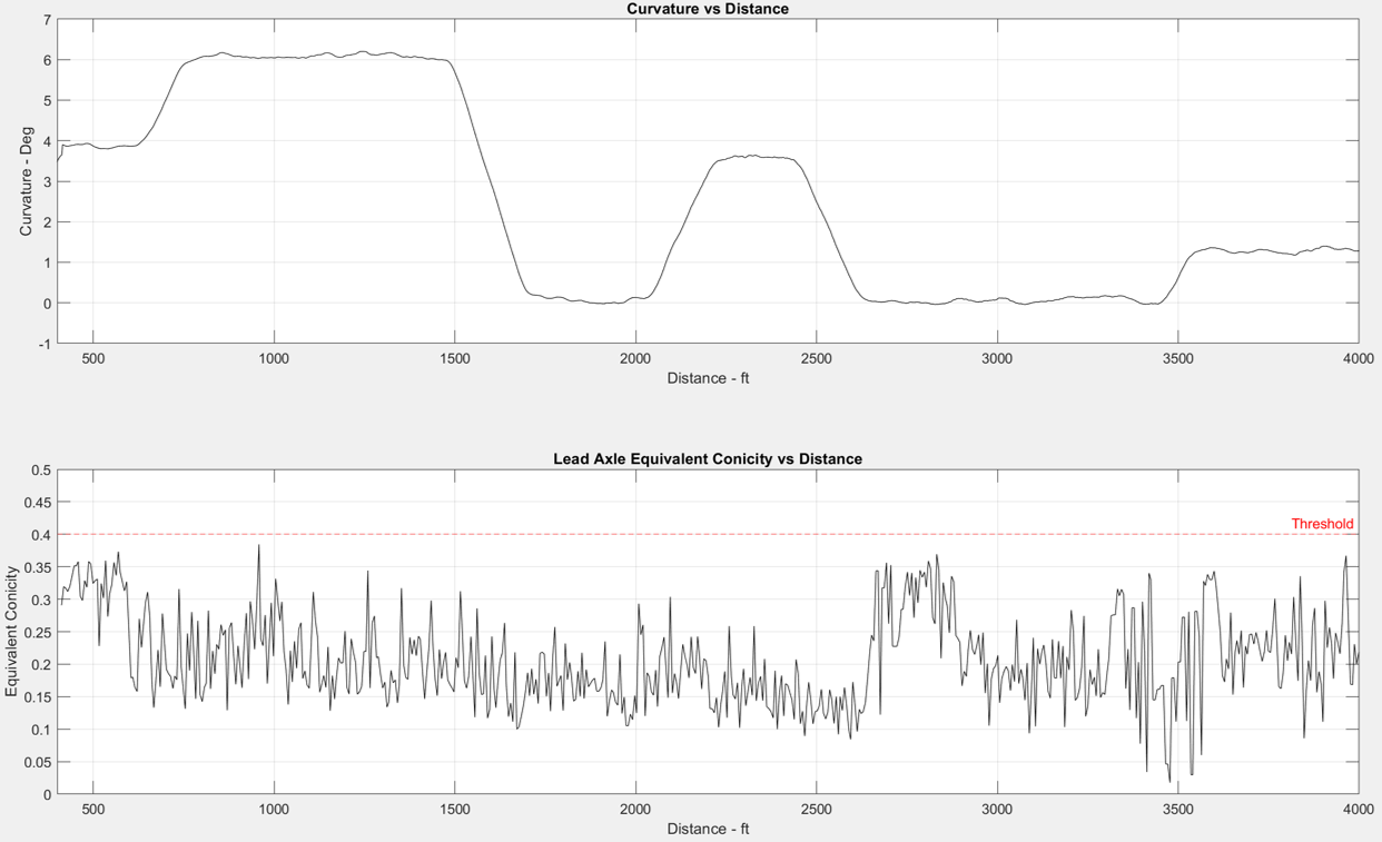 Based on track geometry data, wheel and rail profile data, and vehicle technical specs, ENSCO used a digital twin to model ride quality, equivalent conicity, and L/V ratios of the high rail wheel of the lead axle. Ride quality outputs, in this case, were determined by measuring (within the simulation)