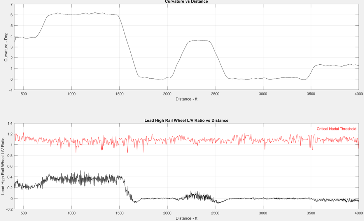 Figure 5 shows simulation data for the lead axle high rail wheel. Note that the Nadal critical threshold varies because it is a function of wheel/rail contact conditions, so the actual L/V ratio required to exceed the threshold changes as those conditions change. At this location, L/Vs for this wheel are well below the threshold, but clearly elevated through the 6-degree curve; another possible indication of poor steering and heavy flange contact, Hogan said.