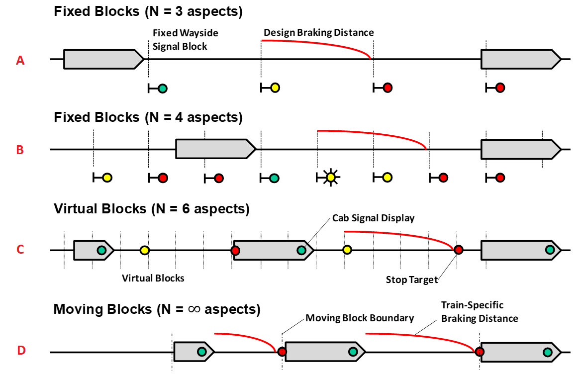Figure 2 (D) illustrates a moving block system. Here, the track is not divided into static blocks at all. Instead, each block is defined by each vehicle’s braking distance. “This allows us to drastically increase train density and track capacity, simply by better utilizing the track infrastructure.”
