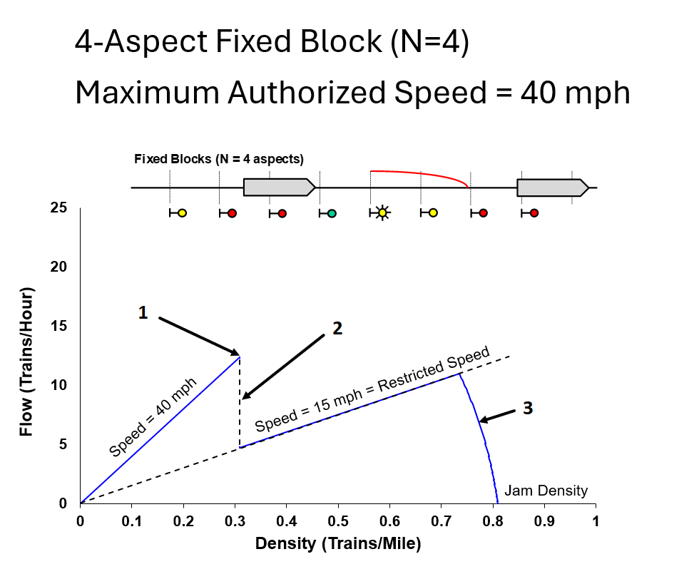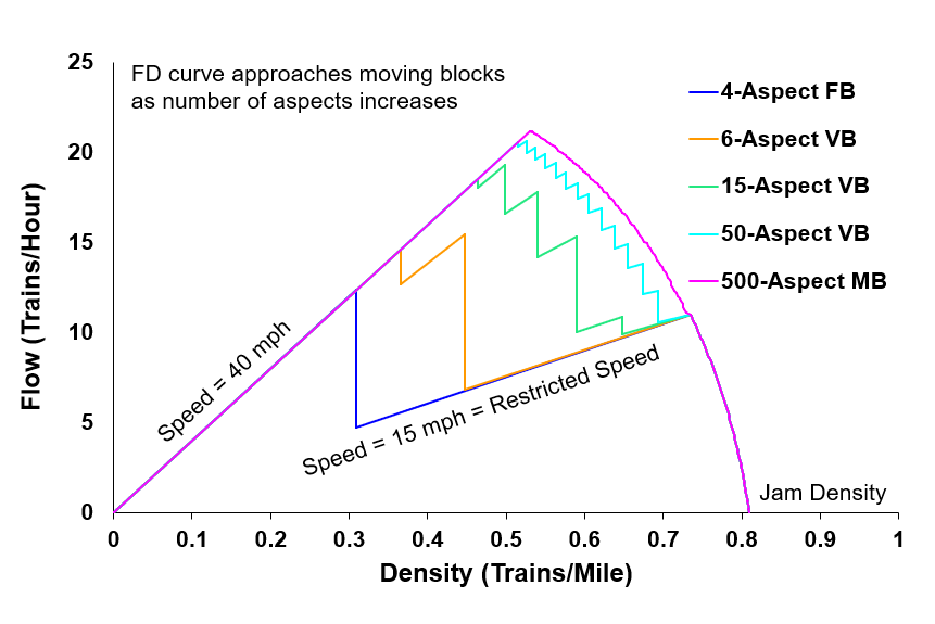 The Texas Railway Analysis and Innovation Node (TRAIN) at the University of Texas at Austin has done research on the effects of various signal block schemata on the relationship between train flow (trains per hour) and density (trains per mile). Figure 3 shows this relationship for a 4-aspect fixed block (the clear, intermediate-approach, approach, and stop signal blocks are the four aspects).