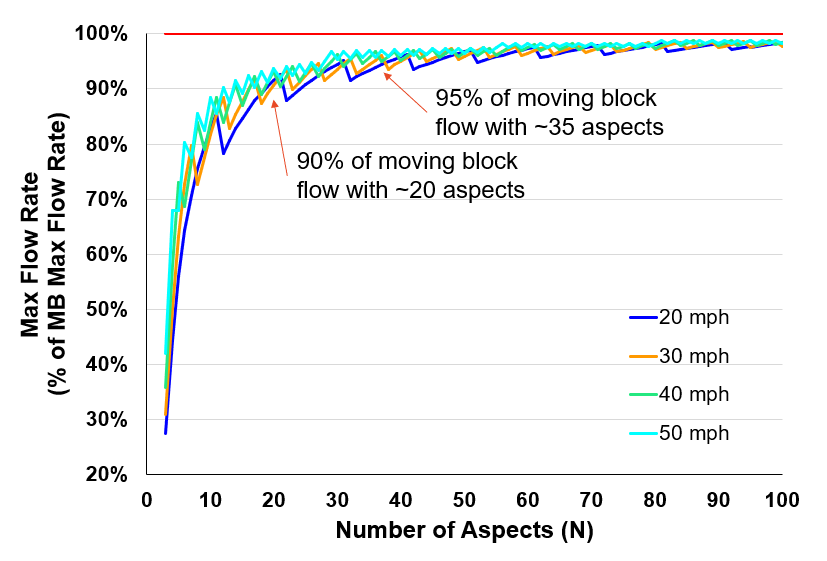 Figure 4 illustrates how flow and density are affected by increasing the number of signal blocks. Each color on the graph corresponds to different number of virtual blocks or aspects. The peak continues to increase (higher flow and higher density) with the addition of signal blocks until it behaves exactly as a moving block system, Dick said. This is represented by the pink arc.