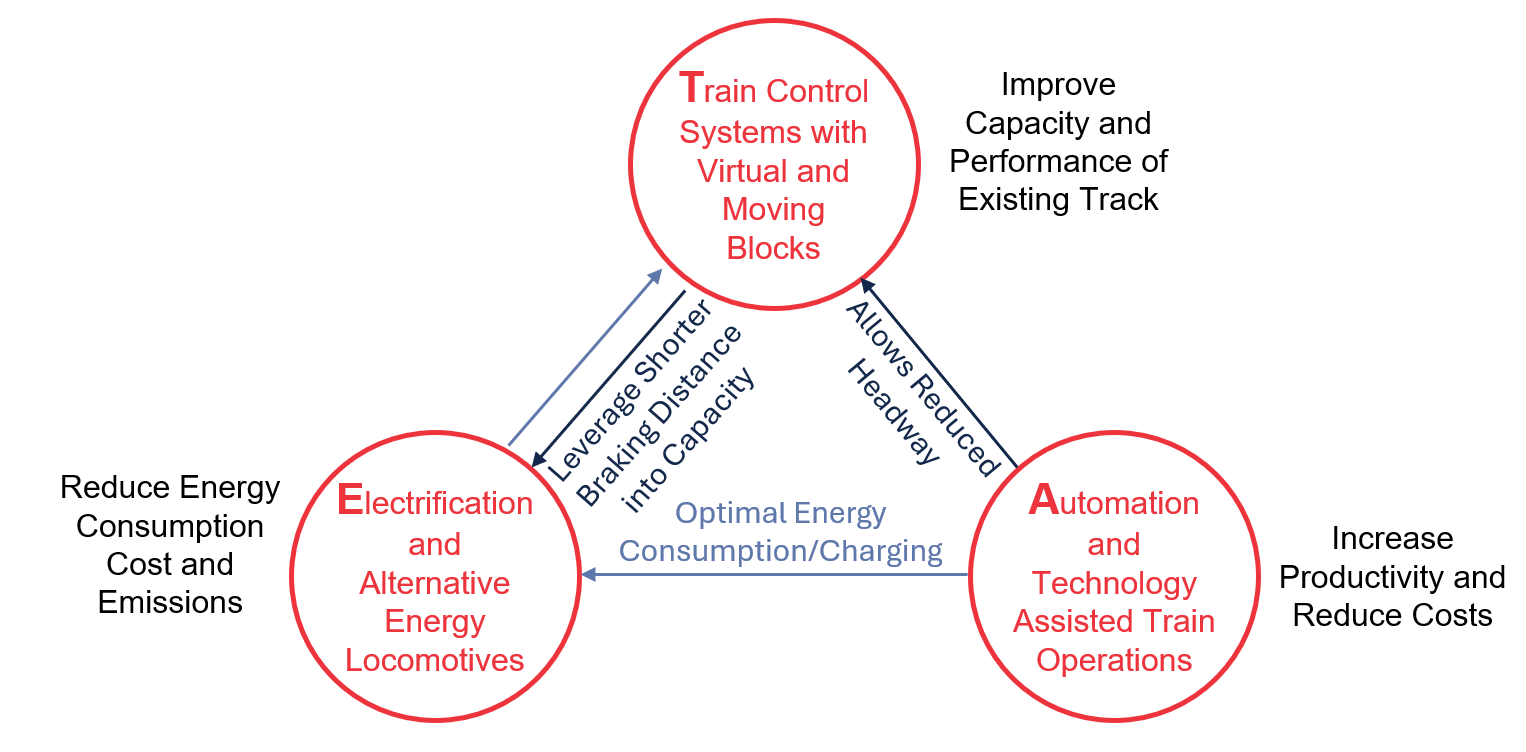 These competitive woes are coupled with the realities of a shifting growth market, one that is turning away from long-haul bulk commodities (where railroads excel) and toward carload and short-haul domestic intermodal freight, Dick said. For railroads to capitalize on this market, trains have to be able to operate, in a sense, more like trucks—emphasizing frequent, reliable service and less overall terminal time. And this is only possible to do by embracing a nexus of interlinked and mutually-supportive technologies and practices of the sort represented by the so-called Train Control, Electrification, and Automation (or TEA) Nexus (see Figure 1).